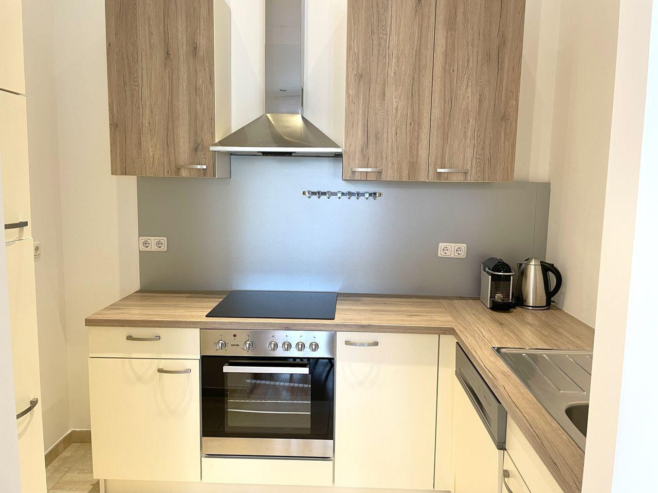 Moderner skandinavischer Einrichtungsstil. Wohnzimmer mit gemütlichem Schlafsofa, Board mit TV, Esstisch mit 4 Stühlen und Designerlampe. Schlafzimmer mit 1,60 x 2 m Bett und geräumigen Einbaukleiderschrank. Neu renoviertes Badezimmer mit Waschmaschine. Küche komplett ausgestattet: mit Kühlschrank und Gefrierfach, Backofen und Ceran-Kochfeld. WMF Wasserkocher und Nespresso-Maschine. Geschirr, Töpfe, Pfanne, Besteck, Kochutensilien, Trink- und Weingläser vorhanden. Smart TV 43 Zoll. Für die Bewohner befindet sich im Keller auch ein großzügiger Saunaraum, der kostenlos genutzt werden kann.