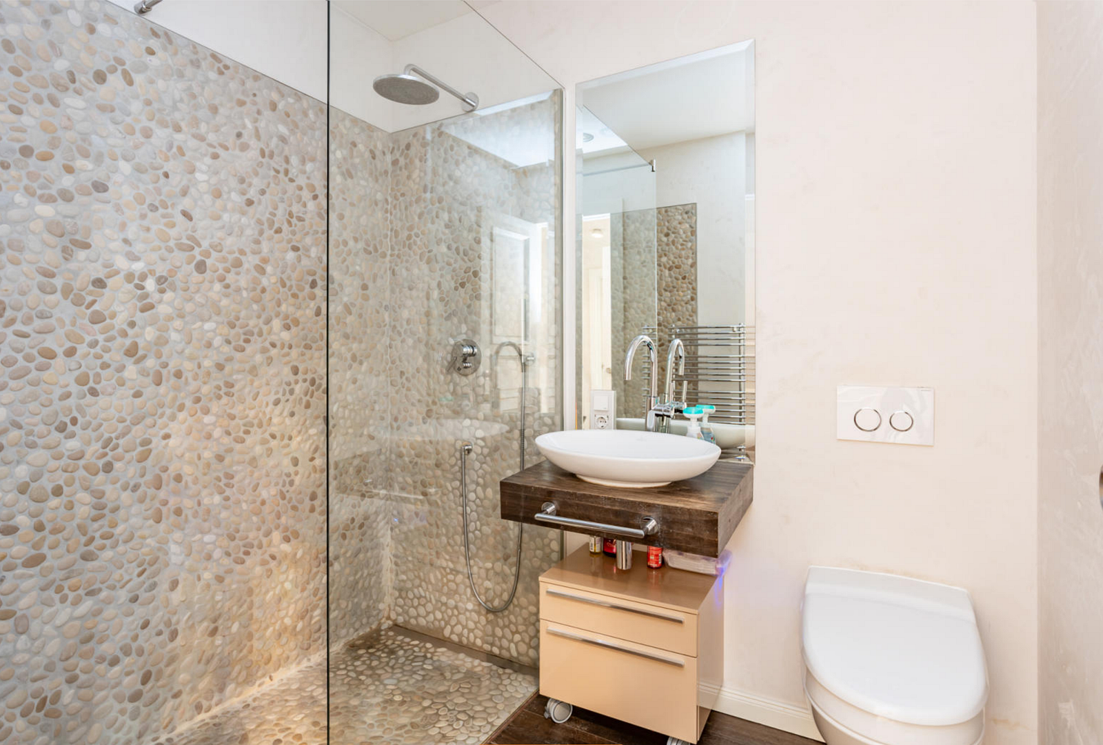 Der Sanitärbereich ist großzügig und hochwertig: Das Masterbad verfügt über Badewanne und Dusche, ein Doppelwaschbecken sowie ein Dusch-WC. Ein weiteres Gäste-Bad bietet Dusche, Waschbecken und Dusch-WC; ergänzend steht ein separates Gäste-WC zur Verfügung. Eine Umkehrosmose-Wasserfilteranlage sorgt für zusätzliche Wasserqualität. Praktisch und alltagstauglich ist zudem der Hauswirtschaftsraum mit Waschmaschine und Trockner.