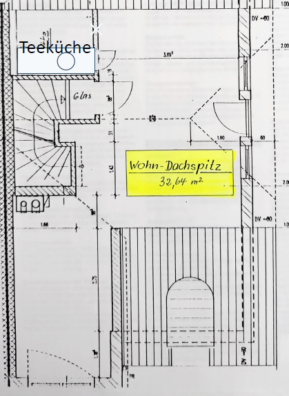 Linoleumfussboden im DG-Studio. Dort befindet sich eine kleine Teeküche mit Kühlschrank.