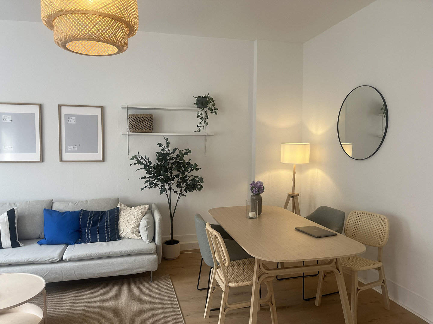 Der Wohnbereich ist harmonisch möbliert und offen gestaltet. Klare Linien, abgestimmte Materialien und eine ruhige Farbgebung schaffen eine angenehme Wohnatmosphäre. Der großzügige Esstisch setzt einen zentralen Akzent im Raum und eignet sich sowohl für gemeinsame Abende als auch für konzentriertes Arbeiten.