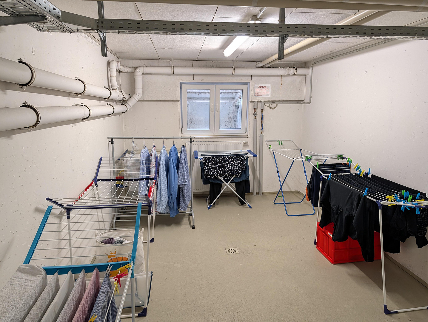 Ergänzend stehen ein separater Kellerraum mit ca. 4,3 m² sowie ein eigener Stellplatz für Waschmaschine und Trockner im gemeinschaftlichen Wasch- und Trockenraum zur Verfügung.