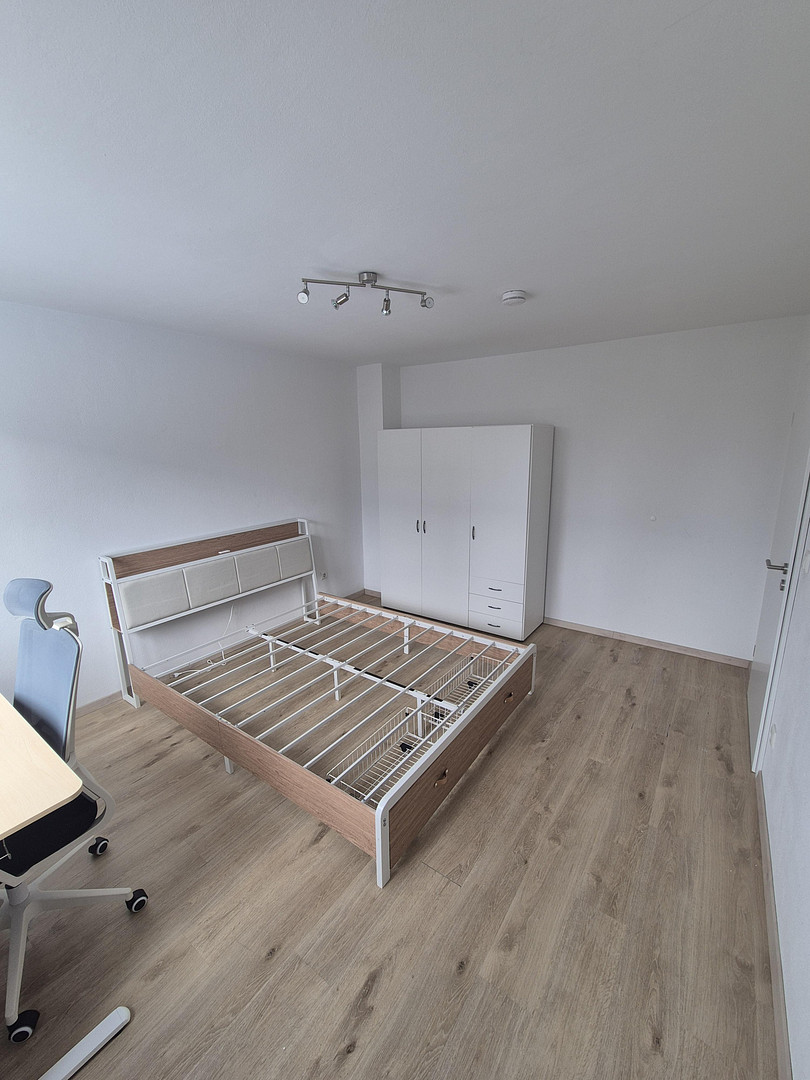Möblierung (aktuell vorhanden, je nach Vereinbarung): Esstisch (Holz) mit 2 Stühlen und Sitzbank, Bettgestell (ohne Matratze), Schreibtisch mit ergonomischem Stuhl, Ankleideschrank.