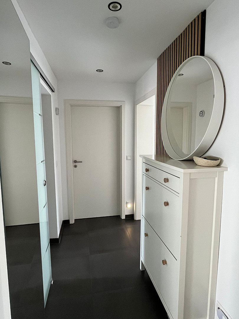 Modernes Badezimmer mit Dusche und hochwertige Fliesen in Bad, Küche und Flur