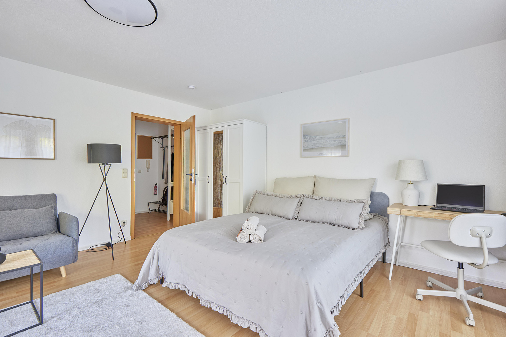 Auf großzügigen 42 Quadratmetern erwartet Sie eine komfortable Unterkunft für bis zu drei Personen. Die Wohnung besticht durch ein einladendes Zimmer, das als Wohn- und Schlafbereich dient. Hier finden Sie ausreichend Platz zum Entspannen und Wohlfühlen.