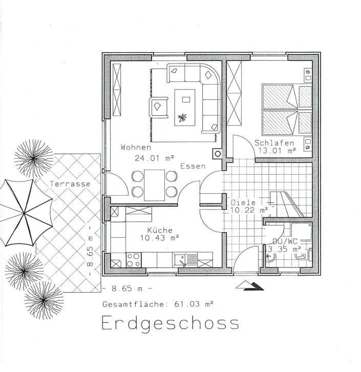 - separate Einliegerwohnung mit einem Schlafzimmer, Wannenbad und offenen Wohn- und Essbereich ebenfalls mit Einbauküche und Hauswirtschaftsraum sowie separter Terrasse