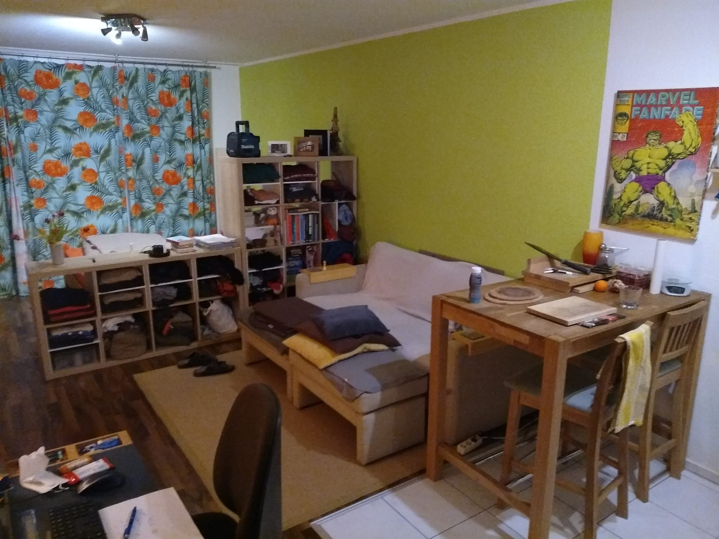 Wenn man die Wohnung betritt, dann steht man direkt in einem geräumigen Flur. Hier ist genügend Platz um eine Garderobe und einen großen Schrank zu platzieren. Rechts befindet sich dann direkt das modern geflieste Badezimmer. Ausgestattet mit Waschbecken, Toilette und Badewanne bietet es ausreichend Platz für die tägliche Körperpflege. Durch den Flur geradeaus befindet sich der Wohnraum mit Blick auf die Grünanlage und der angrenzenden Terrasse. Dieser ist sehr groß geschnitten und kann gut in Wohn- und Schlafbereich unterteilt werden. Auf der rechten Seite befindet sich dann die Küchenzeile. Diese ist ausgestattet mit einer Spüle, zwei Herdplatten und einem Kühlschrank. Die Küche ist bereits in Mietpreis enthalten. In der gesamten Wohnung ist Laminat verlegt. Einen Tiefgaragenstellplatz können Sie auf Wunsch anmieten.