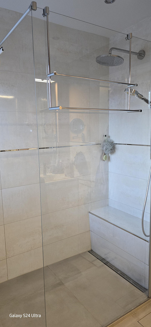 Das Gäste-WC und das Duschbad wurden 2022 in Naturtönen gefliest und mit weißen Sanitärobjekten ausgestattet. Ein Fenster sorgt für Helligkeit.
