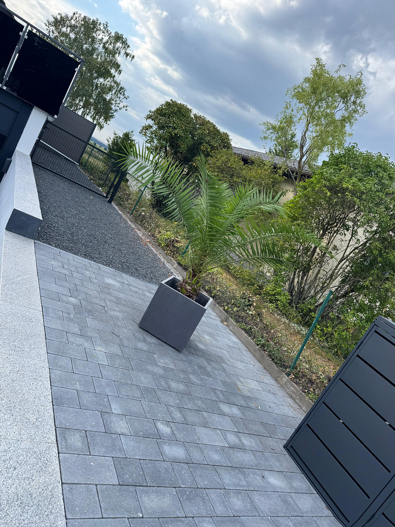 - Komplett gestaltete Außenanlage: Mauer, Zaun, 90x90 cm Terrassenplatten, App-gesteuerte Hausbeleuchtung in verschiedenen Farben, zahlreiche Stellplätze, Mülltonnenverkleidung, Geländer aus Stahl mit schwarzem Glas.