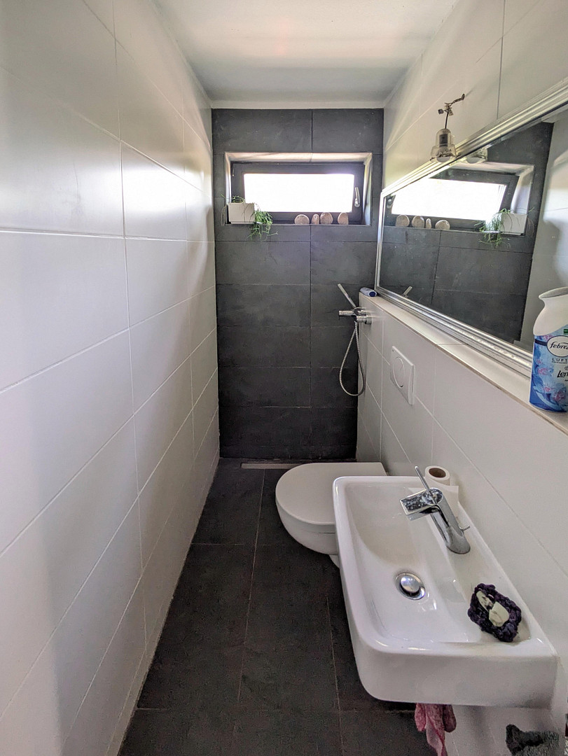 EG: Schieferboden, Fußbodenheizung, Vorbereitung für Kamin, viel Stauraum durch großen Einbaubauschrank, Gäste-WC mit Bodenintegrierter Dusche