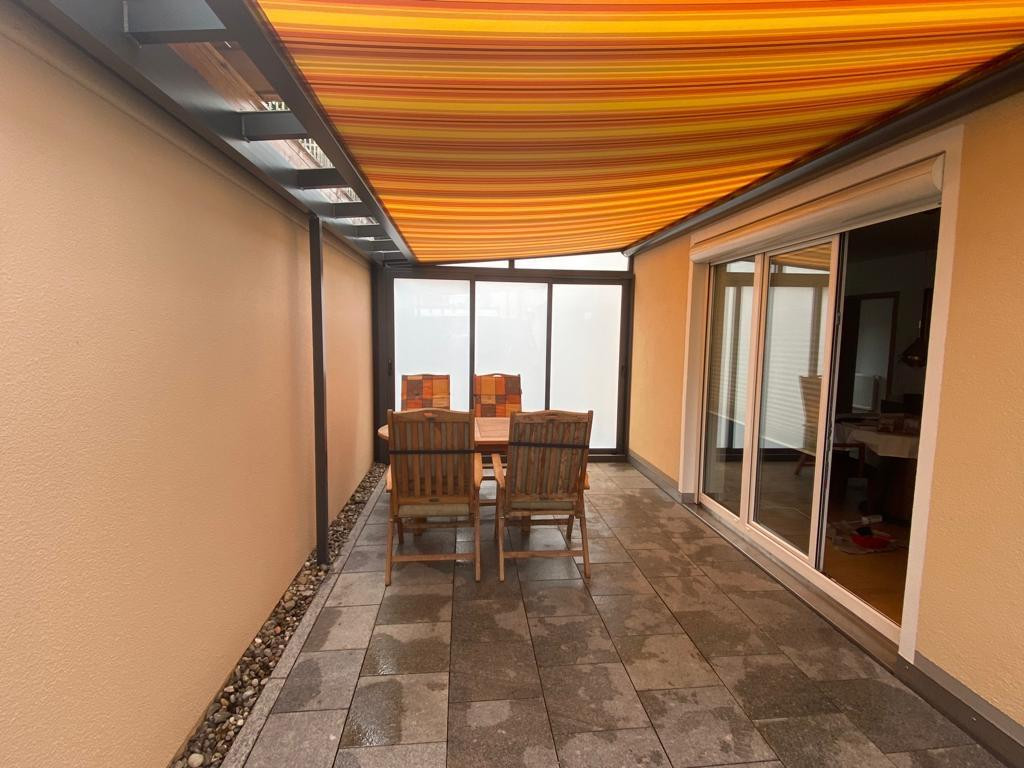 - Überdachte Terrasse mit manueller Sonnenmarkise und Schiebetür zur Garage