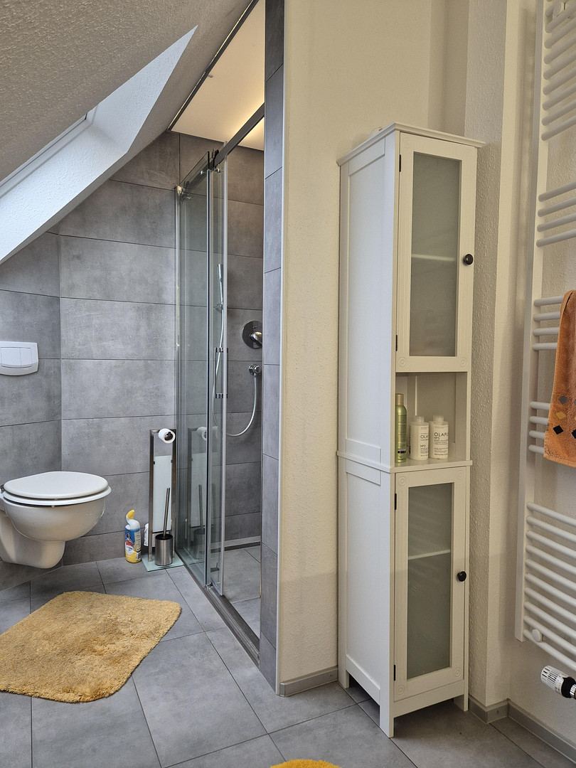 Auf der anderen Seite des Flurs finden wir das 2. Badezimmer mit ebenerdiger Dusche.