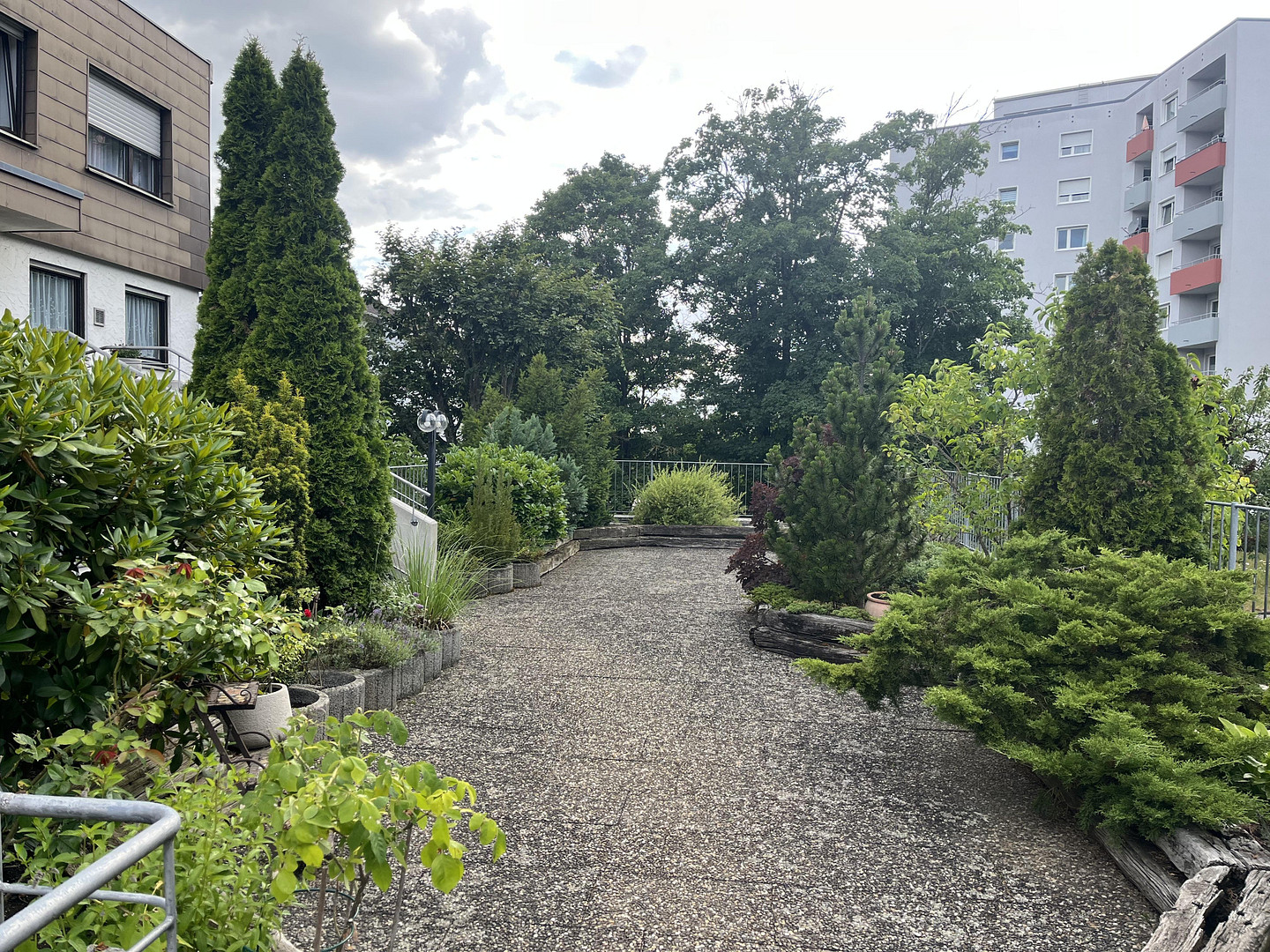 Auf der Südseite des Hauses liegen die Terrassen im Erdgeschoss sowie ein Spielplatz inmitten von viel Grün. Zahlreiche Bäume sorgen für eine ruhige und entspannte Atmosphäre auf den Balkonen. Das Haus befindet sich am Ende einer breiten Sackgasse, die ausschließlich als Zufahrt zu den Garagen dient, wodurch ein besonders ruhiges Wohnumfeld gewährleistet ist.