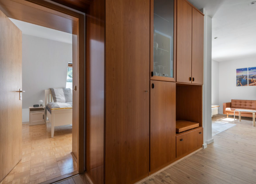 Die Wohnung ist komplett möbliert und eingerichtet. So ausgestattet, dass nichts weiter mitgebracht werden muss. Im Wohnzimmer erwartet Sie eine bequeme Wohnlandschaft mit Ledersofa und Ledersessel, ein offener Kamin und ein großer Smart-TV. Direkt angrenzend befindet sich ein großer Esstisch für maximal vier Personen, mit einer Durchreiche direkt zur Küche. Die Küche ist ebenfalls komplett ausgestattet mit allen Utensilien und Geräten des täglichen Bedarfs. Unter anderem findet man hier schon einen Ofen, eine Mikrowelle, eine Geschirrspülmaschine, Toaster etc. Sogar Handtücher und Bettwäsche gehören zum Inventar.