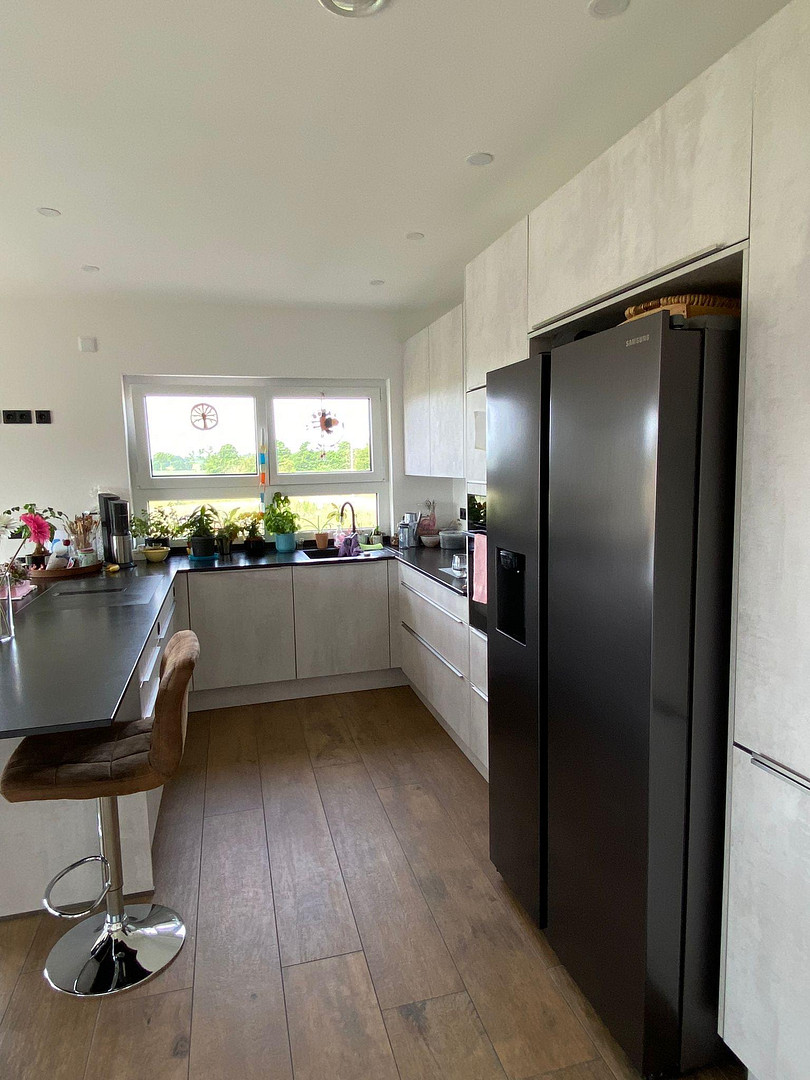 Die Designküche mit Granitarbeitsplatte, Side-by-Side-Kühlschrank und hochwertigen Geräten ist bereits inklusive – ideal für gemeinsame Kochabende. Ein Gästezimmer (oder Homeoffice) sowie ein modernes Dusch-WC komplettieren das Erdgeschoss.
