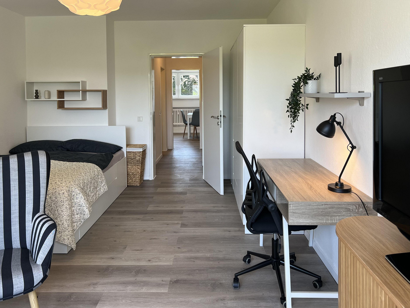 • Geschmackvolle Einrichtung: Ein gemütliches Doppelbett (140x200cm) und ein komfortables Sofa laden zum Entspannen ein.