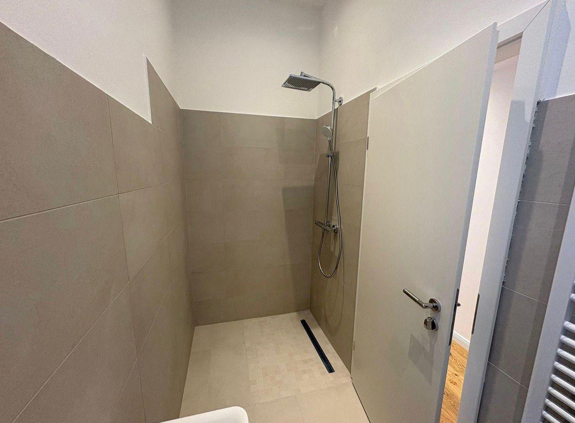 Das Badezimmer überzeugt mit zeitlosen, großformatigen Fliesen, bodengleicher Dusche und modernen Armaturen.