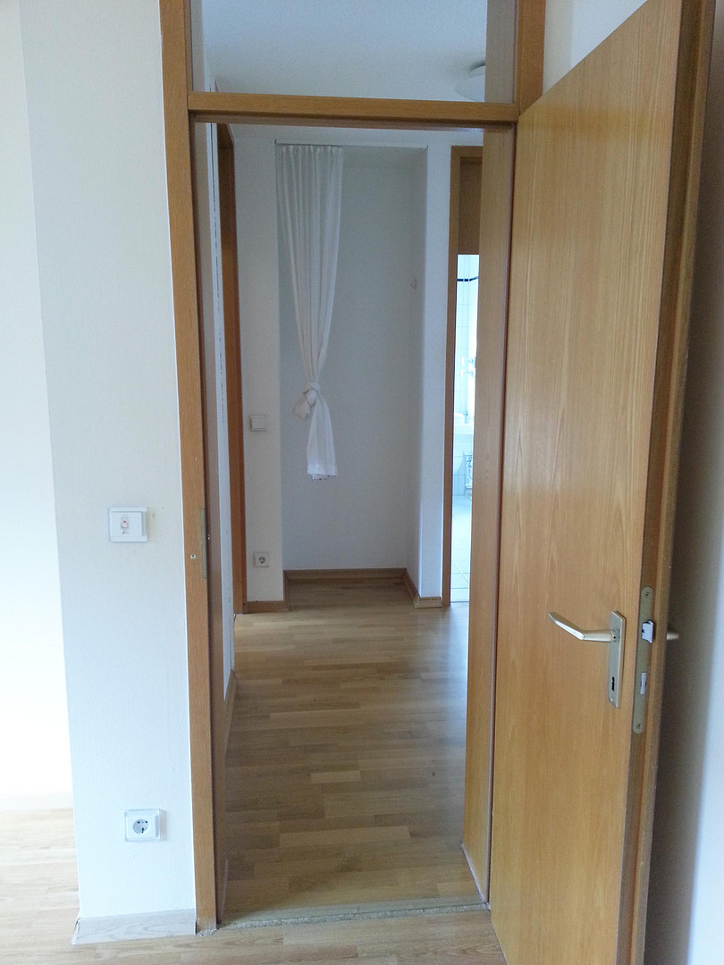 Das zweiten Zimmer, wird gerade als Schlafzimmer genutzt, ist geräumig und verfügt über einen Französischen Balkon. Die beiden Zimmer sind mit Laminat versehen.