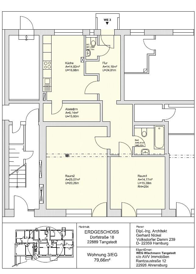 Dorfstraße 18, 22889 Tangstedt – Schleswig-HolsteinDie Wohnung befindet sich im Erdgeschoss eines Wohnhauses im Ortskern von Tangstedt. Einkaufsmöglichkeiten für den täglichen Bedarf sind in der Ortschaft vorhanden. In Tangstedt selbst gibt es drei Kindergärten und einen Waldkindergarten. Tangstedt hat eine Grundschule, eine Einrichtung für die Nachmittagsbetreuung sowie eine Volkshochschule. Weiterführende Schulen, Ärzte, Einkaufshäuser gibt es im benachbarten Norderstedt, Duvenstedt (HH) und Nahe.