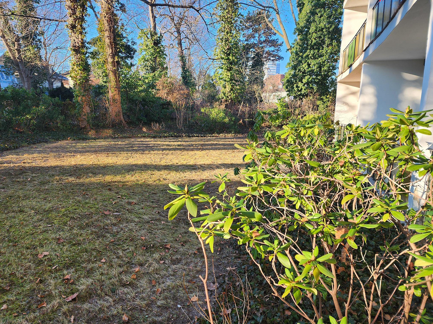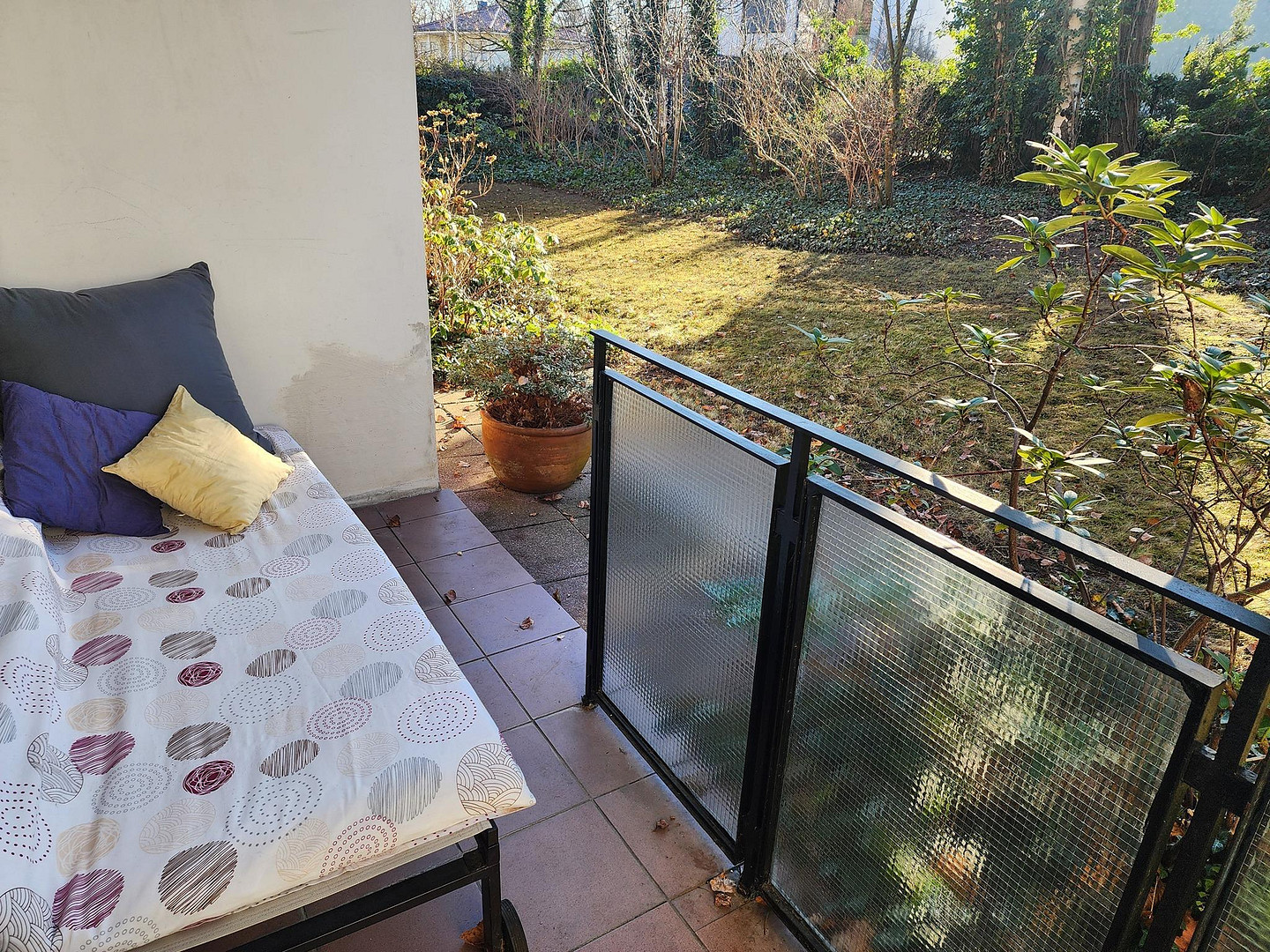 DER AUSSENBEREICH: Die Südfassade aus großflächigen Isolierglasfronten öffnet sich zu einer privaten Terrasse mit Bungalow-Charakter – ein Ort, um mit einem Buch zu entspannen, während man den Wechsel der Jahreszeiten beobachtet. Die Terrasse führt direkt in den rückwärtigen Garten, ein ungestörtes Refugium, das nur den Erdgeschoss-Wohnungen zugänglich ist und in dem die Privatsphäre ganz natürlich respektiert wird. Gestaltet als pflegeleichte Rasenfläche und umrahmt von altem Baumbestand, ist der Garten ein lebendiger Lebensraum für die lokale Tierwelt. Für Menschen, die eine Verbindung zur Natur und eine lärmfreie Umgebung schätzen, wird diese sich stetig wandelnde Kulisse zu einer Quelle innerer Ruhe.