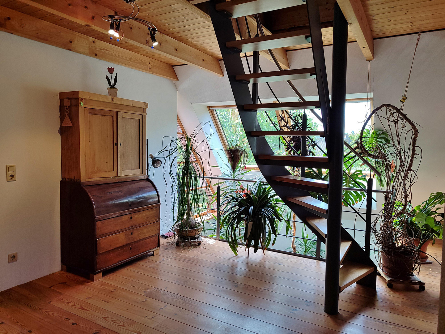 Eine breite geschwungene Stahlwangentreppe führt ins Obergeschoss mit der sonnigen Galerie. Im Osten liegt das geräumige Schlafzimmer sowie im Westen das helle Vollbad mit Eckwanne und bodengleicher Dusche.