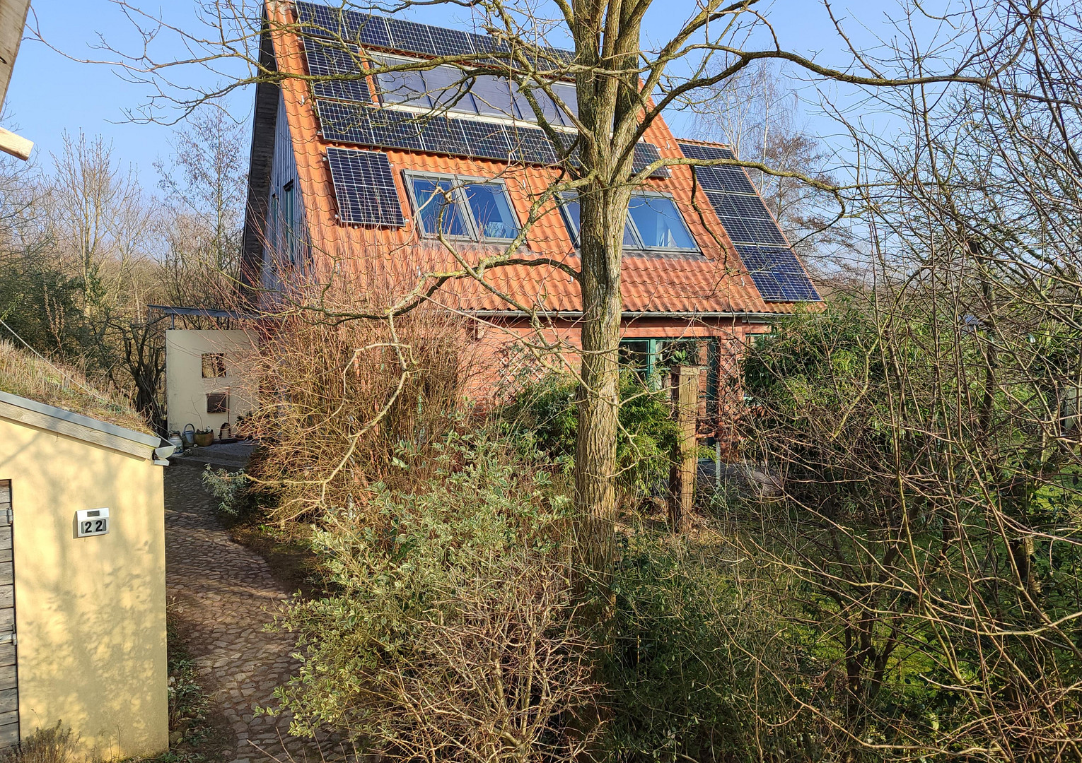 Die Fußbodenheizung im Erdgeschoss und die Wandheizung im Obergeschoss arbeiten mit sehr niedrigen Vorlauftemperaturen. Die Gas-Brennwertheizung (Baujahr 2001) ist in die Solarthermieanlage mit Heizungsunterstützung und Pufferspeicher integriert. Eine Photovoltaikanlage mit Speicher (Baujahr 2022) erzeugt 3/4 des benötigten Stroms. Das Haus ist auf passive solare Gewinne und dauerhaft geringe Energiekosten ausgelegt.