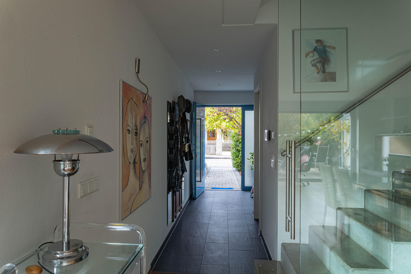 Im Erdgeschoss befinden sich zudem ein Gäste-WC mit Pissoir sowie eine Garderobe. Die helle, hochwertige Plana-Küche bietet durch bodentiefe Fenster direkten Zugang zum Vorgarten – praktisch für den Alltag, etwa beim Entladen von Einkäufen.