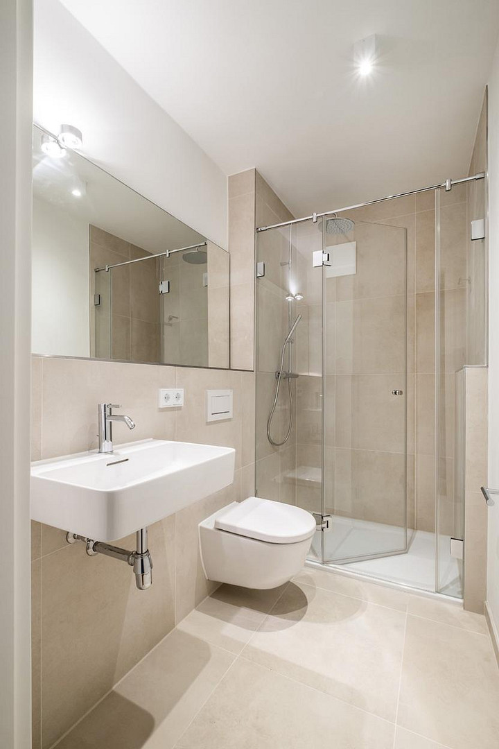 In den Wohnräumen sorgt ein edler Designboden in „Honey Oak“-Optik für eine warme, wohnliche Atmosphäre. Das stilvolle Duschbad ist mit handgefertigten italienischen Keramikfliesen sowie formschönen weißen Sanitärobjekten ausgestattet. Fußbodenheizung in allen Räumen garantiert behagliche Wärme.