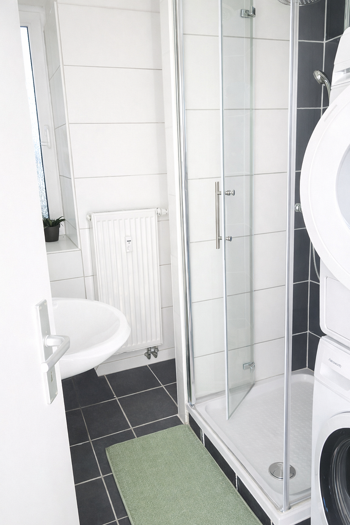Badezimmer: Das vollständig sanierte Bad überzeugt mit einer eleganten Kombination aus hellen und dunklen Fliesen. Die moderne Dusche mit Glastrennwand, eine entspannende Badewanne sowie zeitgemäße Sanitärobjekte erfüllen höchste Ansprüche an Komfort und Design.