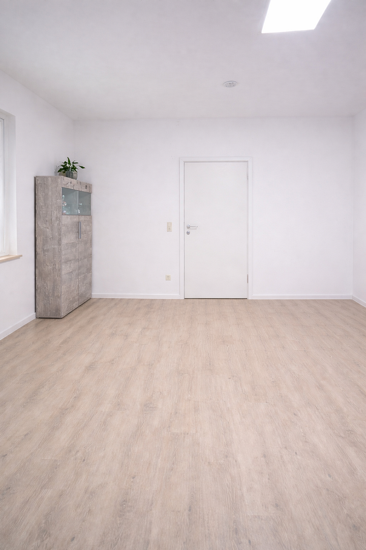 Wohnbereich: Lichtdurchflutete Räume mit modernen Laminatböden in warmer Holzoptik schaffen ein gemütliches Ambiente. Die dezente Beleuchtung und zukünftige Möblierung setzen perfekte Akzente.