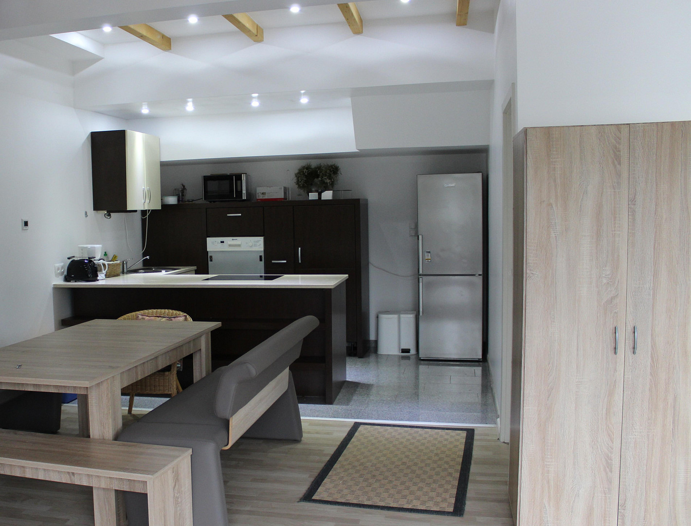 Die Einbauküche wird derzeit fachmännisch überholt. Alle Räume werden frisch gestrichen. Die Fenster sind bodentief und verfügen über eine Dreifachverglasung. In jedem Raum ist eine Fußbodenheizung installiert. Neben dem großzügigen Duschbad ist ein Gäste WC vorhanden. Elektrische Rolläden sowie eine Wasserenthärtungsanlage runden die Ausstattung ab.
