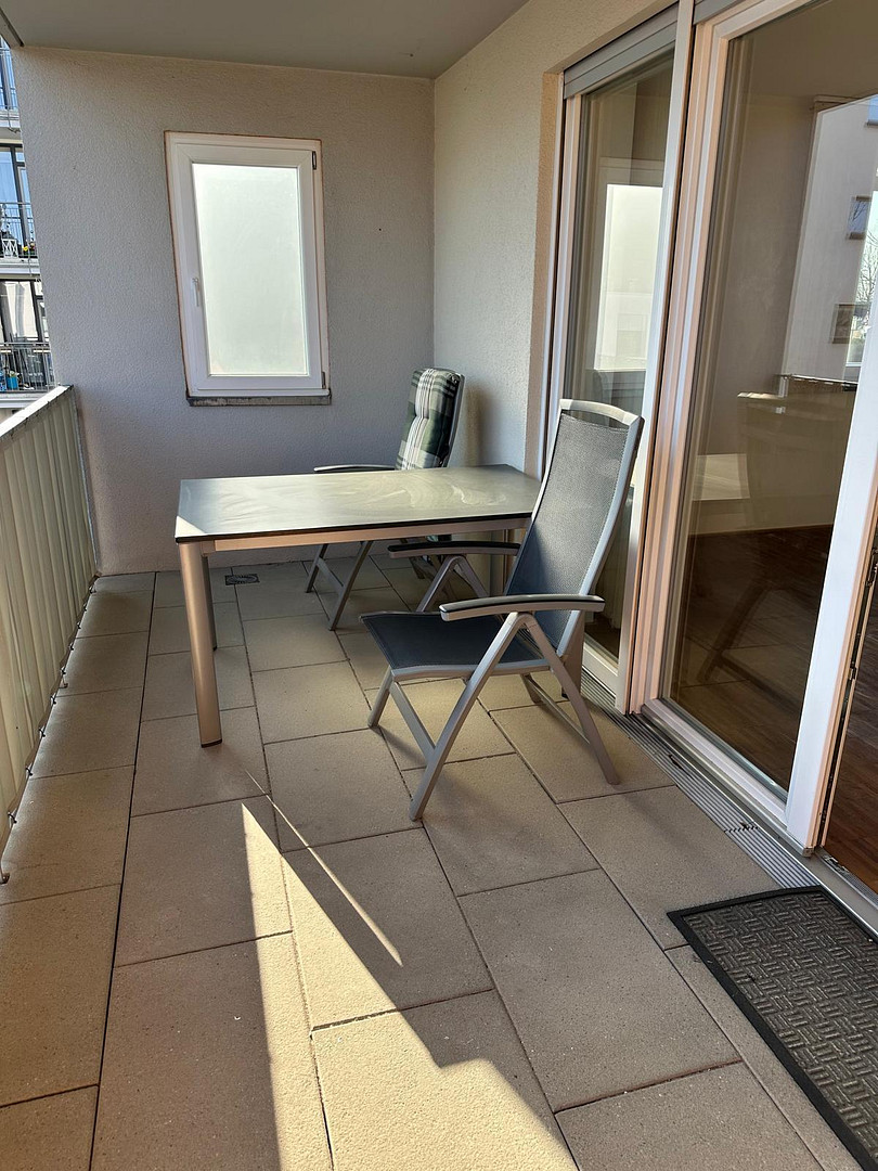Vom Wohnbereich aus gelangen Sie auf den überdachten Balkon, der mit einem wetterfesten Tisch, vier passenden Stühlen sowie einem hochwertigen Sonnenschirm ausgestattet ist. Der geschützte Außenbereich bietet ideale Voraussetzungen für entspannte Stunden im Freien und kann nahezu ganzjährig genutzt werden.
