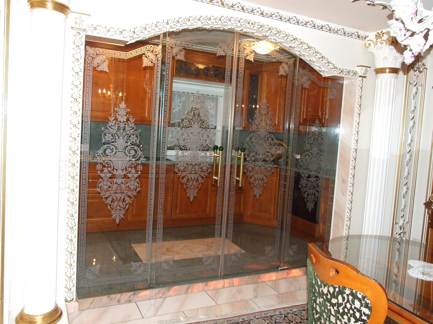 Durch den exklusiven Edelweiß/rosa Marmor Boden in Schmetterling Bilder ausgelegt, und den wunderschönen Stuck (Barock und Rokoko Stil) an den Wänden und Decken, fühlt man ein Hauch von Luxus.