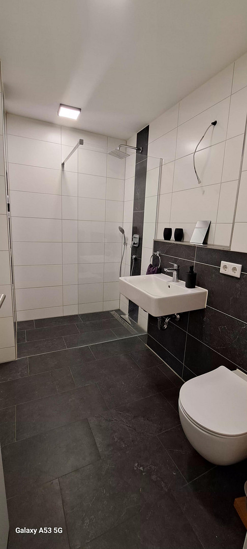 Gäste-WC mit bodengleicher moderner Dusche, WC und Waschbecken
