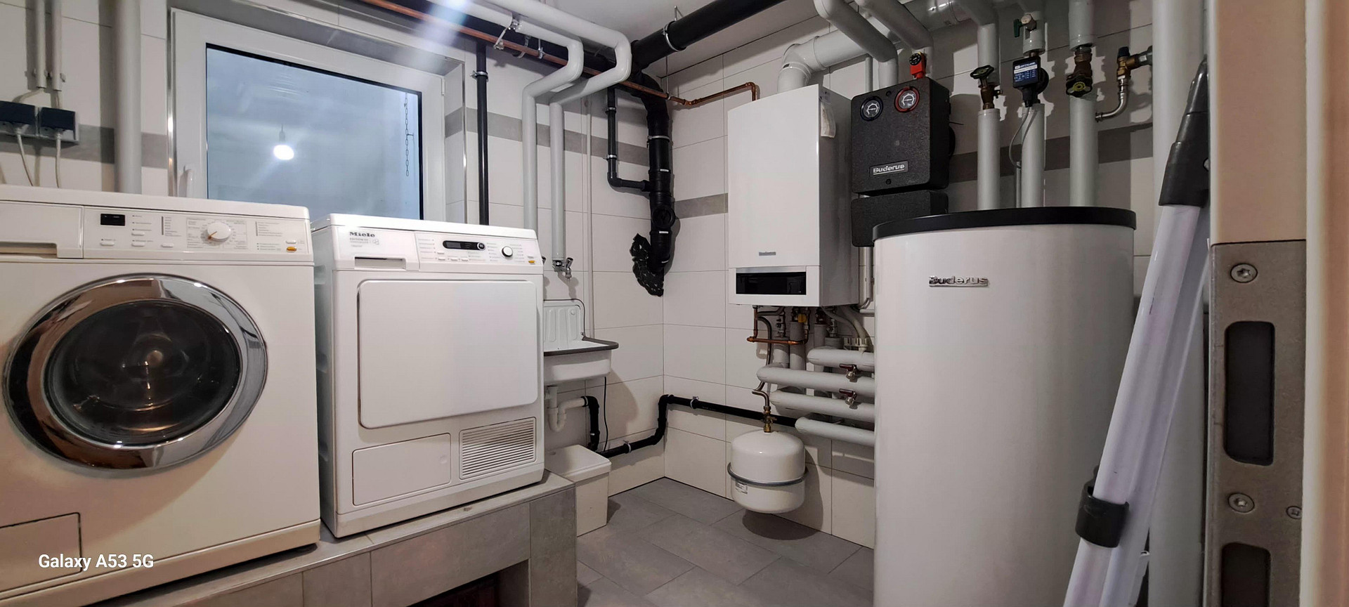 Wasch-/Technikraum mit vollständig gefliesten Wänden und Boden