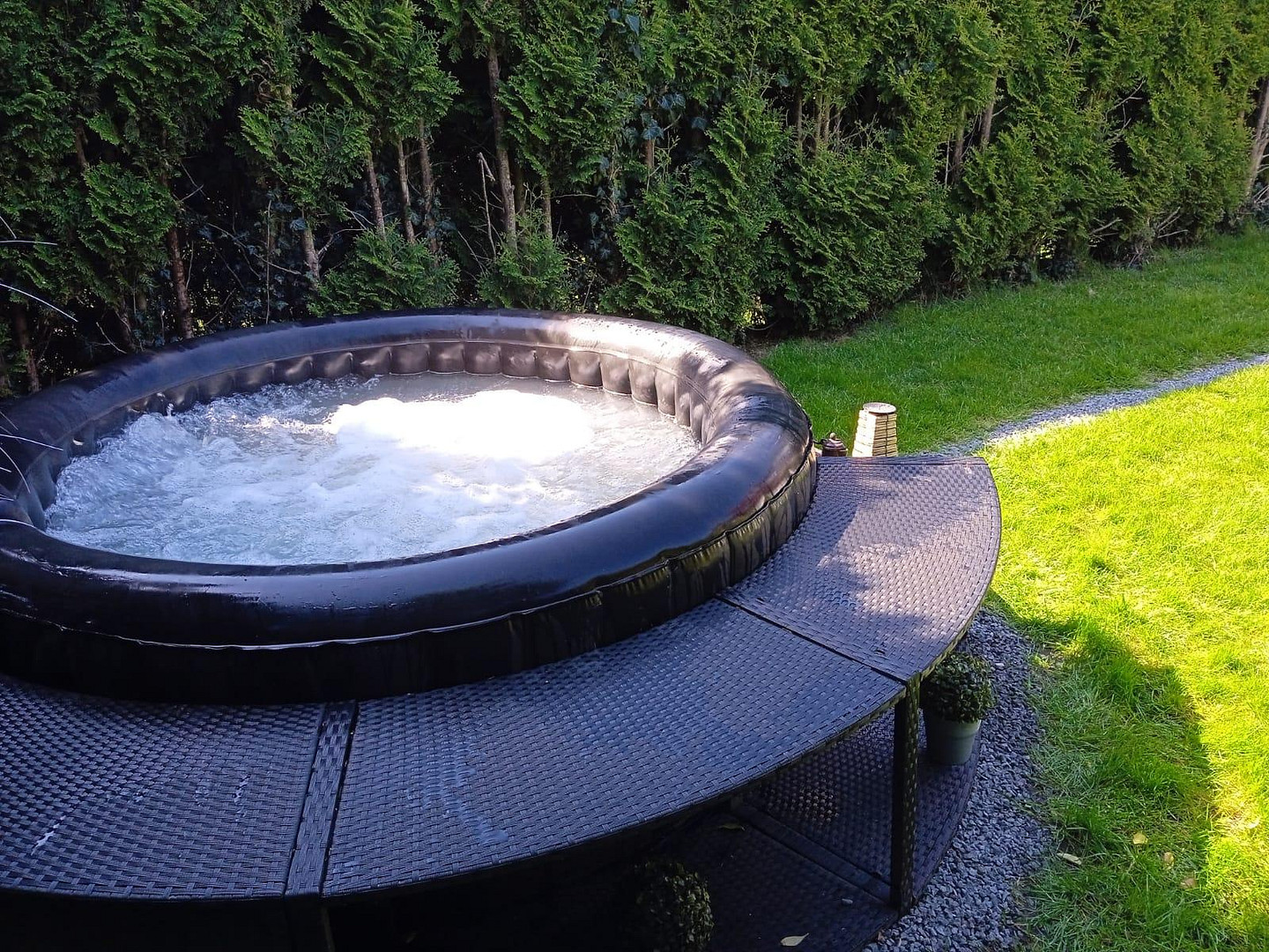 Außerdem im Garten : Gartenhaus, Pool, Dusche und Loungemöbel.