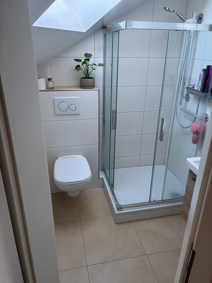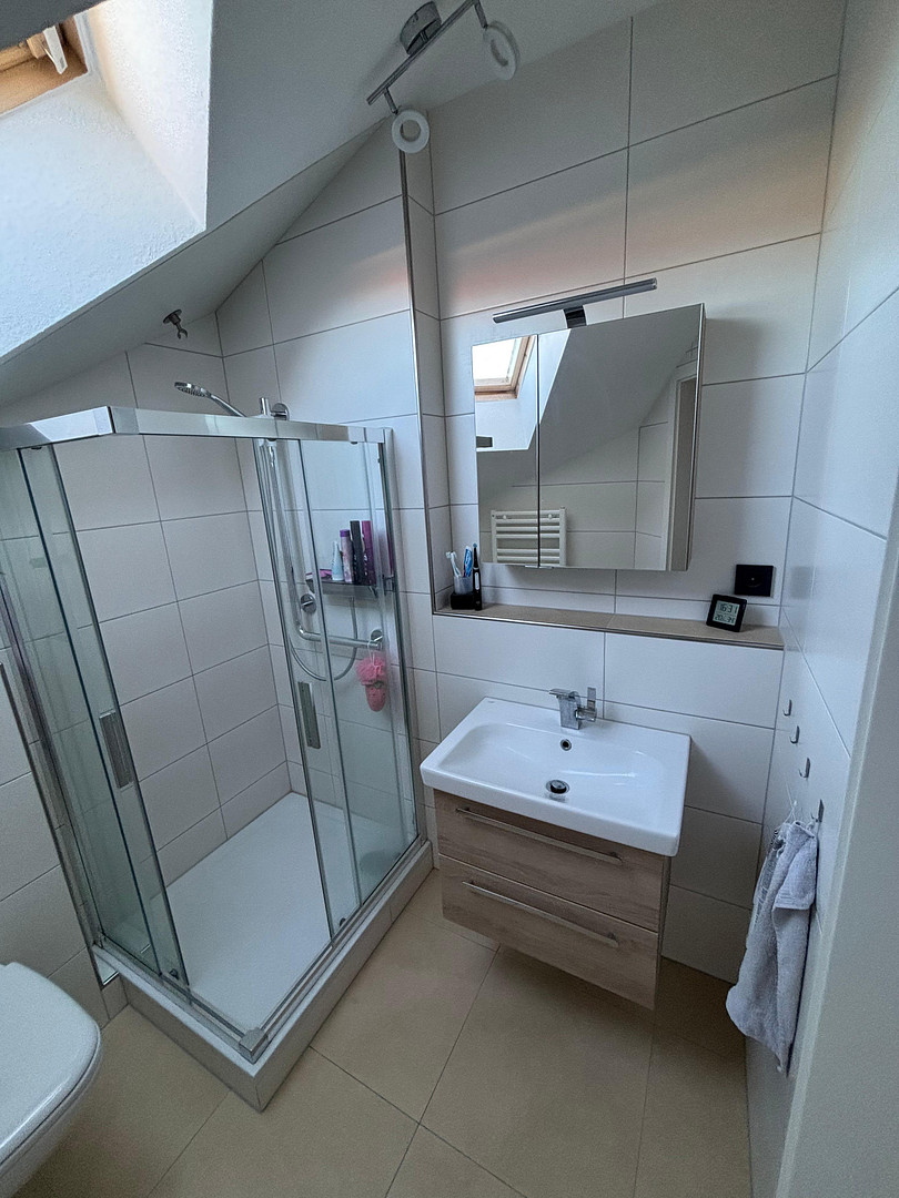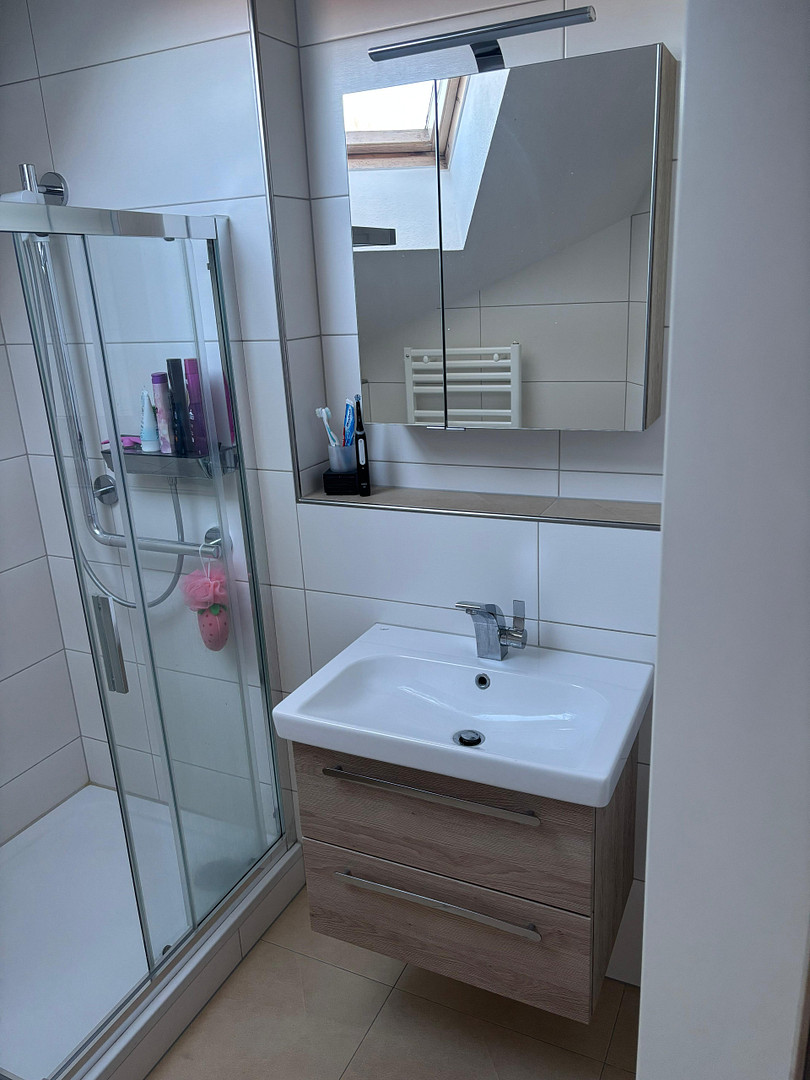 Das renovierte Badezimmer verfügt über eine moderne Duschkabine sowie einem Waschtisch mit Unter- und Spiegelschrank.