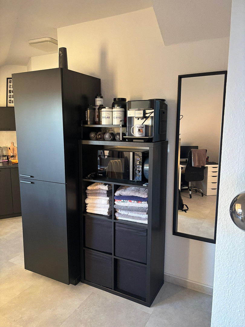 Die Wohnung ist teilmöbliert. Zur Ausstattung zählt eine hochwertige Küche mit einem Backofen, Induktionskochfeld, Spülmaschine sowie einer großen Kühl- Gefrierkombination.