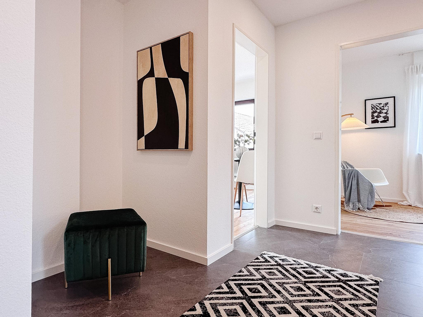 Der großzügige Wohnbereich bildet das Herzstück der Wohnung. Von hier aus gelangen Sie direkt auf den Balkon mit Blick ins Grüne – ein angenehmer Rückzugsort für den ersten Kaffee am Morgen oder entspannte Stunden am Abend. Die durchdachte Raumaufteilung ermöglicht ein harmonisches Zusammenspiel aus Wohnen, Arbeiten und persönlichem Rückzug.