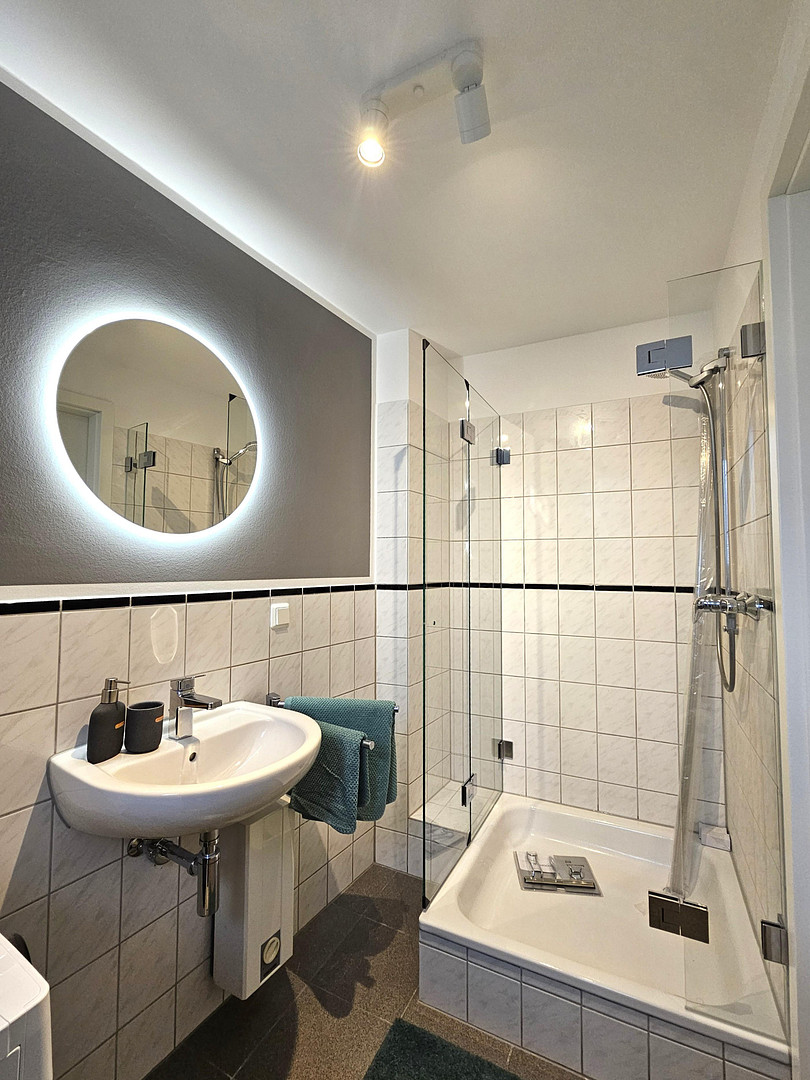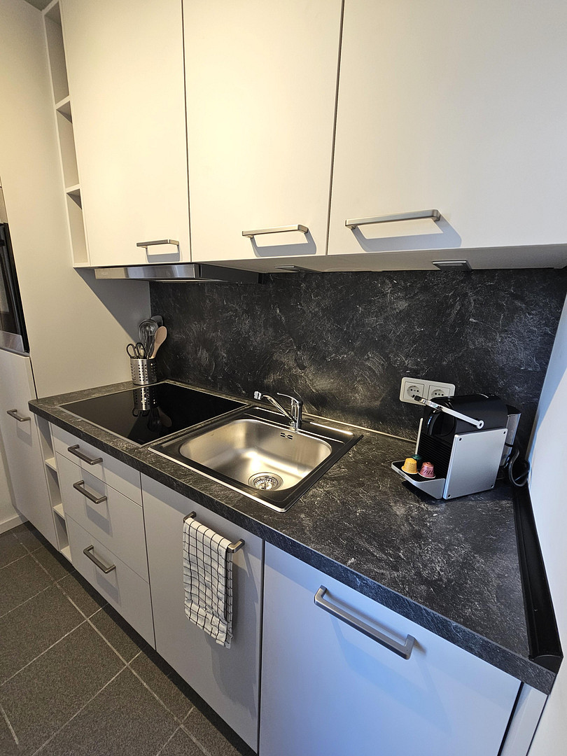 Die vollständig möblierte und ausgestattete Wohnung verfügt über einen Wohn- und Schlafbereich, ein Duschbad mit Tageslicht und eine moderne Einbauküche (Herd, Backofen, Kühlschrank mit Eisfach, Nespresso Maschine, eine Spülmaschine) sowie einen Waschtrockner.