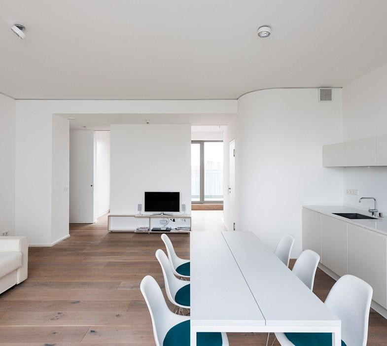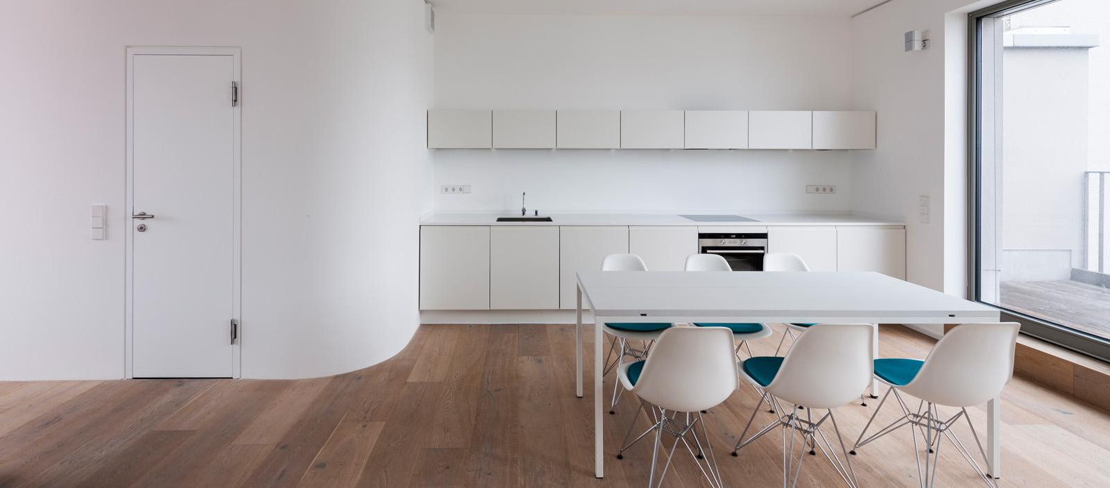 Die Ausstattung der Wohnung entspricht aktuell modernen hohen Standards. Sie verfügt über einen weiß geölten Holzdielen mit Fußbodenheizung, großformatigen Fliesen, eine Walk-In Dusche mit Glasabtrennung, kontollierte Be- und Entlüftung mit zentraler Wärmerückgewinnung, Brauchwasseranlage zum Recyclen des Brauchwassers für die Toilettenspülung. Darüber hinaus ist die Wohnung mit einer hochwertigen Einbauküche mit Corianarbeitsplatte und Oberschränken ausgestattet. Eine LAN-Verkabelung und eine Audioverkabelung für eine Dolby Surround sind vorhanden.