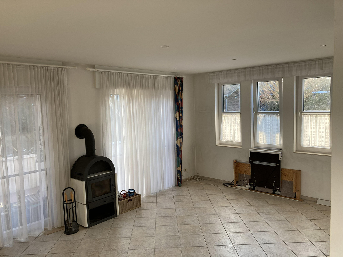 Rechts vom Esszimmer führen zwei Stufen in das lichtdurchflutete Wohnzimmer mit zwei doppelflügeligen, bodentiefen Fenstern zur Terrasse und weiteren drei Fenstern. Ein Kaminofen mit Sichtfenster verbreitet wohlige Wärme.