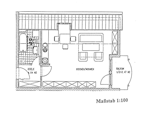 Die Wohnung überzeugt durch ihre helle und freundliche Atmosphäre. Der großzügige Wohn- und Schlafbereich, in dem eine kleine Küche integriert ist, bietet ausreichend Platz zum Wohnen, Arbeiten und Entspannen. Die Dachschräge verleiht dem Raum eine besonders behagliche Wohnatmosphäre.