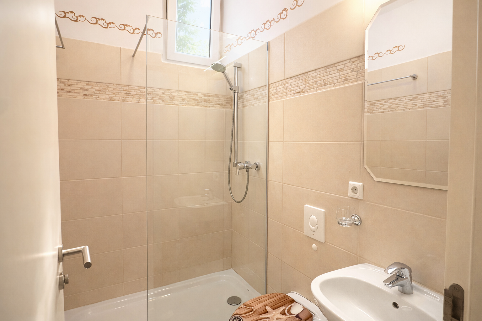- Zweites Bad mit großer Dusche, wandhängendem WC und Waschtisch – ebenfalls hochwertig ausgestattet
