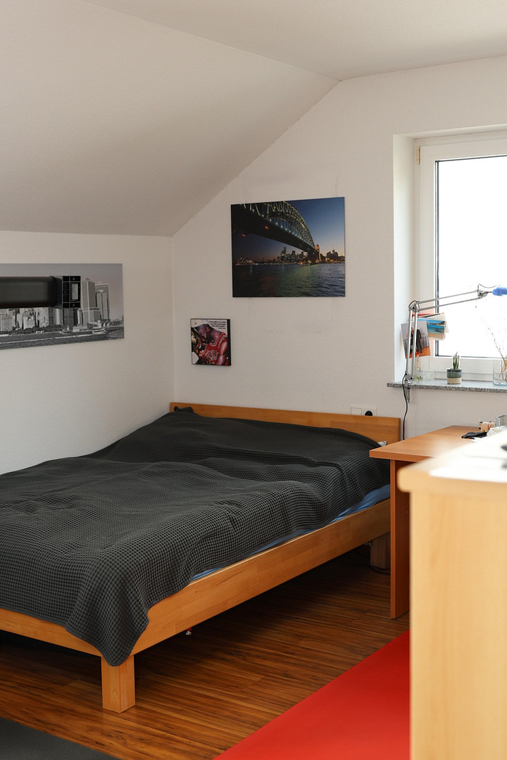 Im Obergeschoss stehen drei flexibel nutzbare Schlafzimmer (eins davon mit begehbarer Ankleide) zur Verfügung, die sich ideal als Eltern-, Kinder- oder Gästezimmer eignen. Besonders komfortabel: Zwei der Zimmer führen direkt auf eine sonnige, große Loggia. Ein großzügiges helles Tageslichtbad mit Einbaumöbel und moderner, ebenerdiger Dusche ergänzt die obere Etage.
