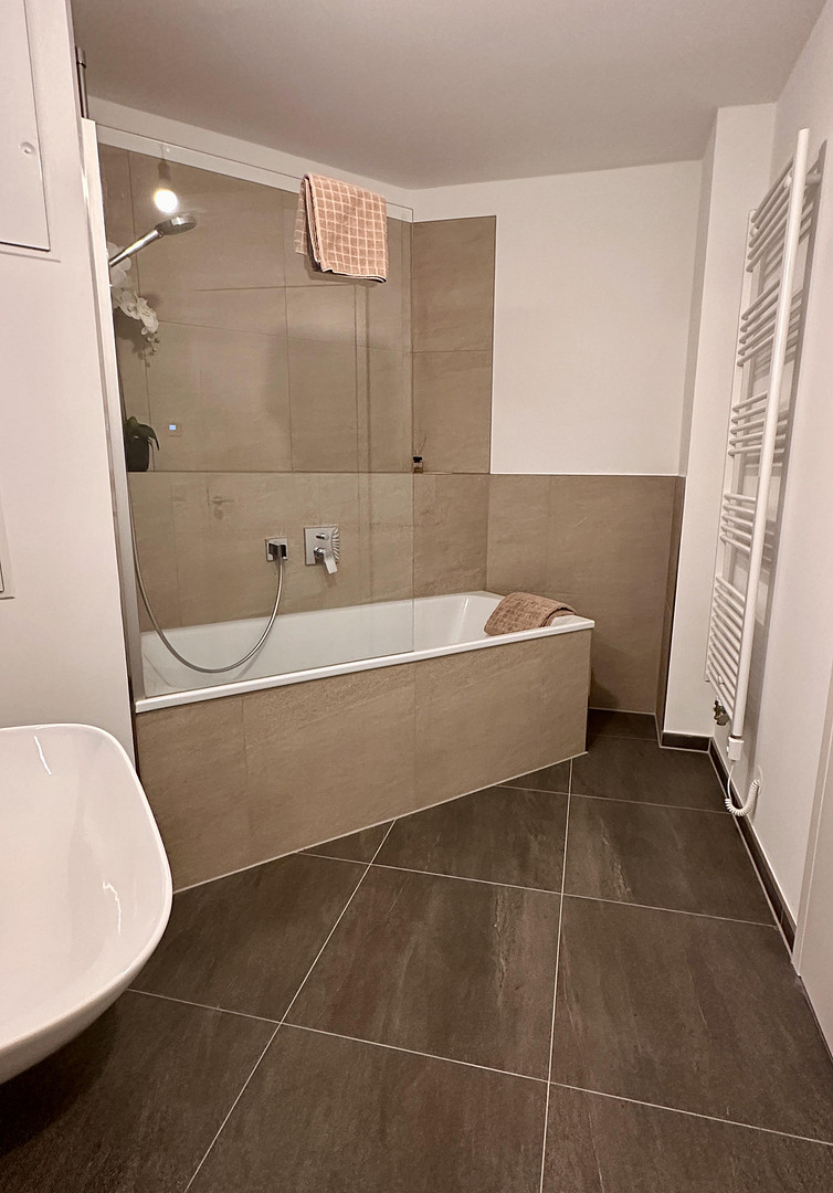 - modernes Bad mit Badewanne und Glasduschabtrennung