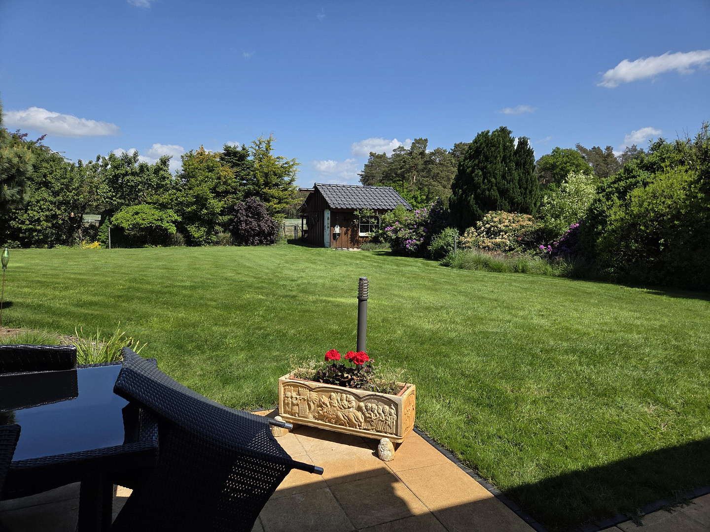 Der komplett gestaltete und eingefriedete Garten enthält ein Gerätehaus aus Holz mit einer Dacheindeckung aus Tonziegeln und einen überdachten Grillplatz.
