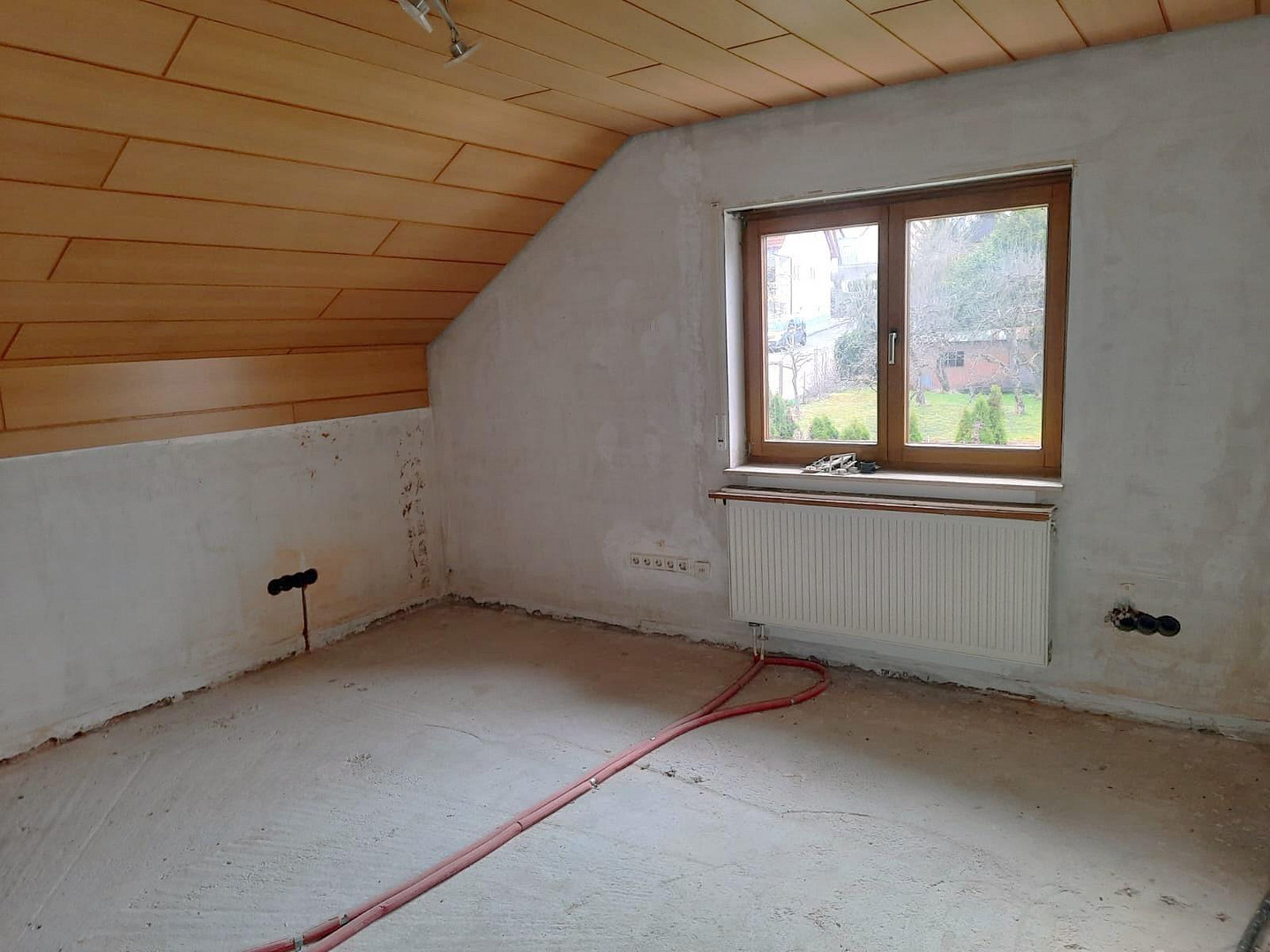 Das Haus wurde für eine umfassende Modernisierung vorbereitet. Der Estrich wurde entfernt, um Platz für eine moderne Fußbodenheizung (geringe Vorlauftemperatur) und eine energieeffiziente Wärmepumpe zu schaffen. Auch die Schlitze für zusätzliche Stromleitungen und Netzwerkverbindungen sind bereits vorhanden.