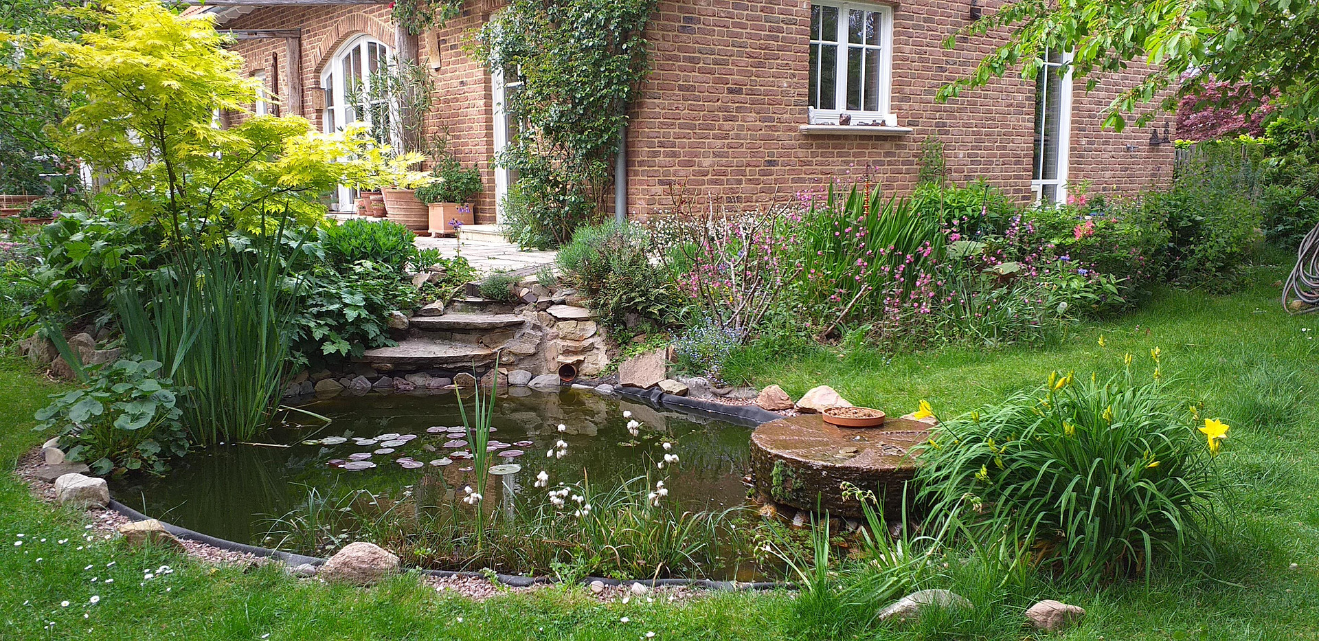 Der Außenbereich ist außergewöhnlich hochwertig gestaltet. Der große Garten bietet alten Baumbestand, Hecken, Stauden, Blumenbeete, viele Kräuter, Obstbäume und Beerensträucher sowie einen Teich mit Wasserspiel. Hochbeete und ein Kompostsystem ermöglichen naturnahes Gärtnern und ersparen die "Braune Tonne". Besonders hervorzuheben sind das unten gemauerte und verglaste Gewächshaus mit Strom- und Wasseranschluss sowie eine Pergola aus historischen Eichenbalken, welche im Sommer mit einem Sonnensegel bespannt werden kann und dann auch regenfest ist.
