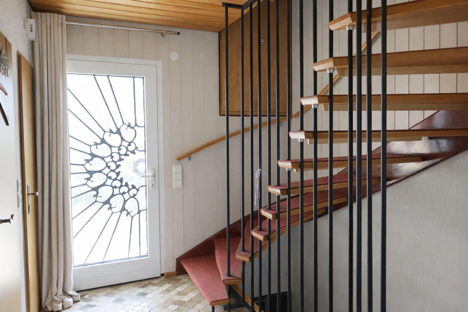 Die Decken im Flur, Wohnzimmer, Küche usw. sind teilweise getäfelt und in sehr gutem Zustand. Der Flur und Küche sind mit Fließen ausgelegt. Die Treppen EG. KG. 1.OG und Flure im 1. OG. ist Teppichboden verlegt. Der Dachboden ist isoliert, jedoch nicht das Dach. Die Terrasse ist gefliest, überdacht und könnte auch zum Wintergarten umgebaut werden. Im 1.OG. Schlafzimmer gibt es einen Balkon, der auch zur Sicherheit mit einem Gitter verschlossen werden kann.