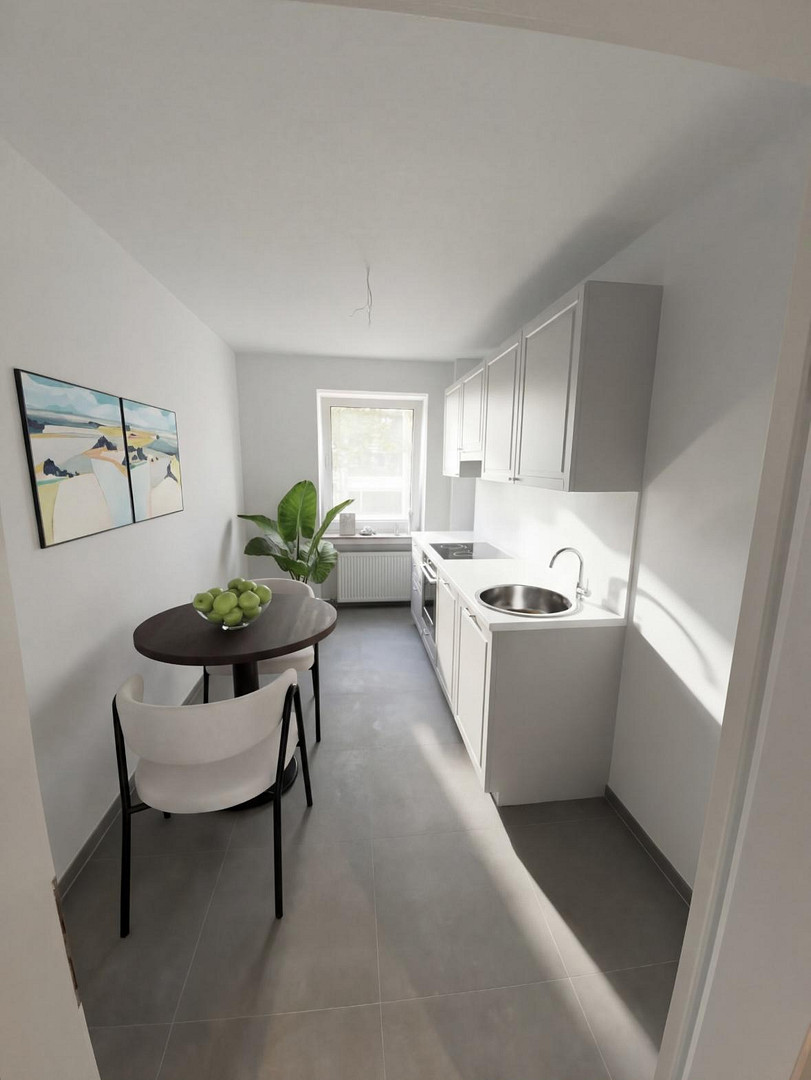 Im Zuge der Renovierung wurden Flur, Küche und Badezimmer mit modernen, hochwertigen Fliesen ausgestattet. Das stilvolle Bad verfügt über eine komfortable, begehbare Dusche. In Schlafzimmer und Kinderzimmer wurde ein ansprechender Vinylboden verlegt, der eine warme Wohnatmosphäre schafft.